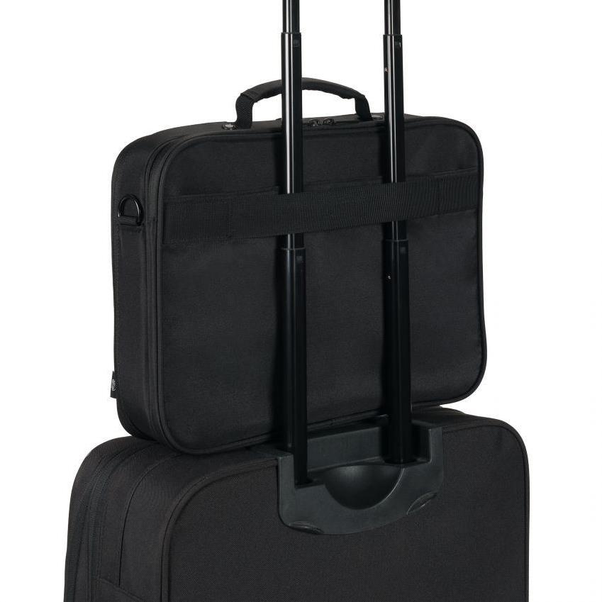 This bag combines security and functionality with a lockable, padded notebook compartment that provides optimal protection thanks to the reinforced frame. The front pocket is specially designed for mobile accessories, while the zipped pocket offers space for a power supply and cable. A hidden compartment for a GPS tracker means you can always keep an eye on your bag, while a zipped pocket with RFID blocking protects personal data from unauthorized access. Important documents can be safely stored in the rear document pocket, while the padded shoulder strap ensures comfortable carrying. The trolley strap makes it easy to attach the bag to your suitcase. The bag is complemented by water-repellent material that reliably protects the contents from the elements.