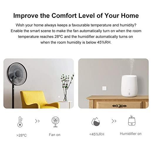 U pametnoj sceni možete postaviti uvjet da se ventilator uključuje/isključuje kada temperatura dosegne svoju graničnu vrijednost ili da odvlaživač zraka u vašoj sobi počne raditi kada je vlažnost veća, čime se sprječava rast plijesni i alergena.